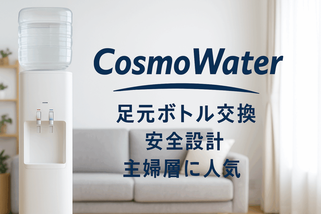 コスモウォーターは、採水から出荷までワンストップ管理を徹底した宅配水サービス。ボトル差し替えが足元でできる設計で、女性にも優しい構造です。