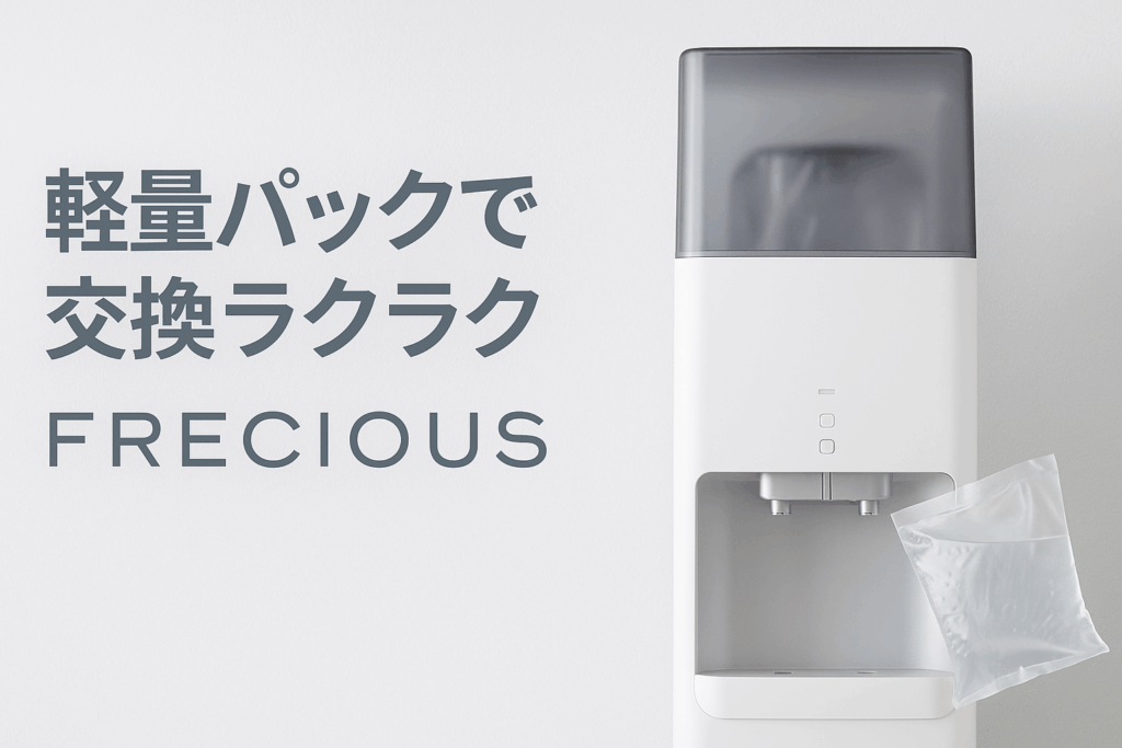 フレシャスは、女性に人気の高いデザイン性ウォーターサーバー。軽量パック水で交換が簡単。省エネ設計で電気代を抑えられるのも魅力です。