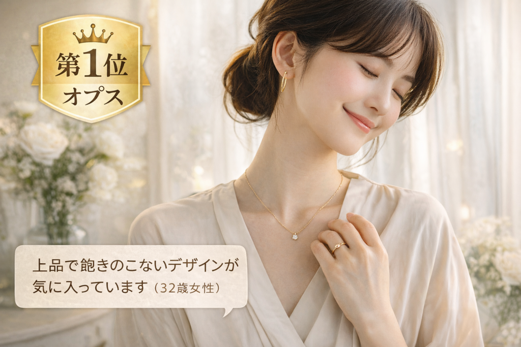 オプスは「失敗しない大人ジュエリー」を探している30代女性に最適なブランドです。派手すぎず、地味すぎない絶妙なデザインは、年齢を重ねたからこそ似合う魅力を引き出してくれます。初めての本格ジュエリーとしても、買い足し用としてもおすすめできる1位にふさわしいブランドです。